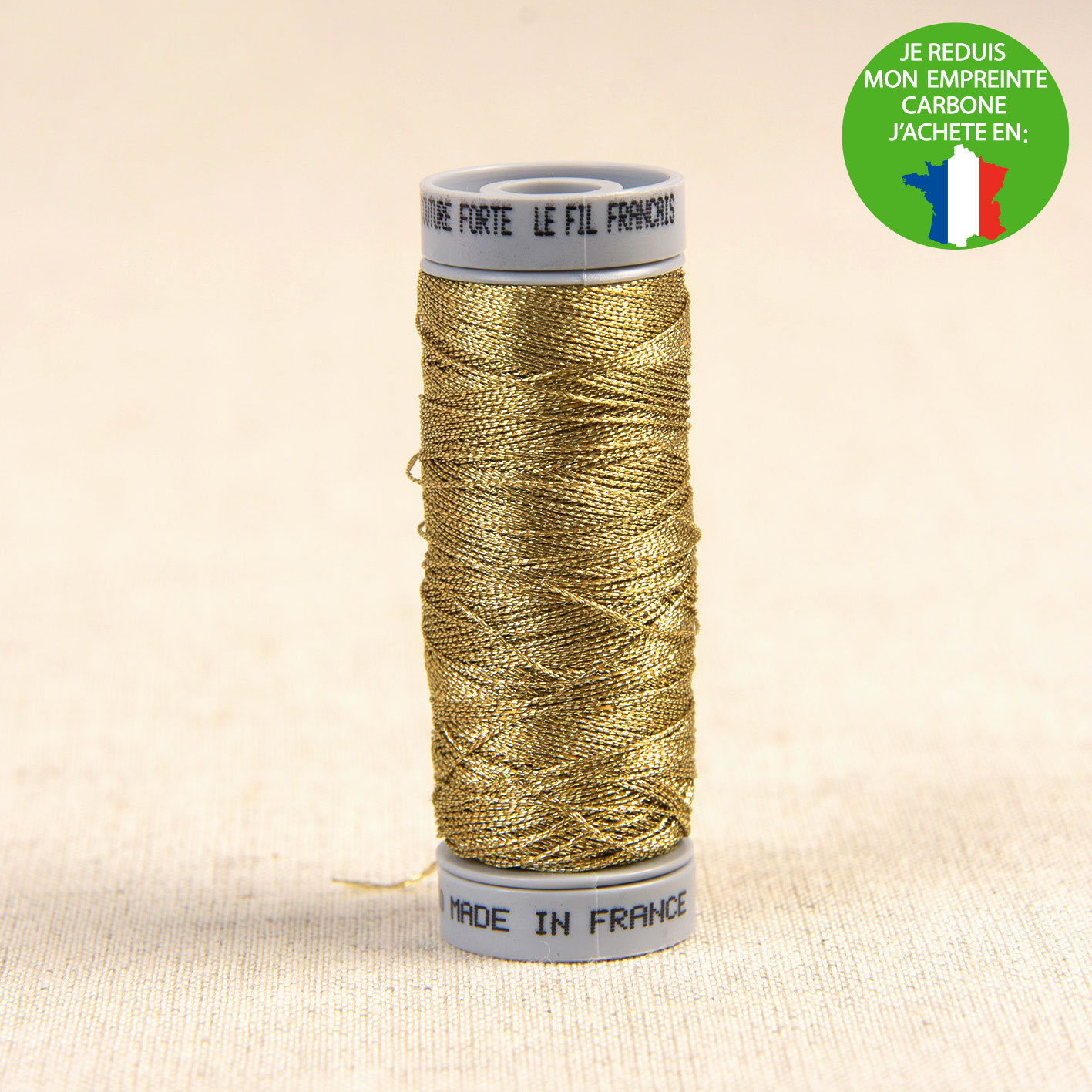 Fil métallique à coudre : 60% Polyester – 40% Lurex. Couleurs disponibles : Or / Or foncé / Argent Bobine de 50m.
